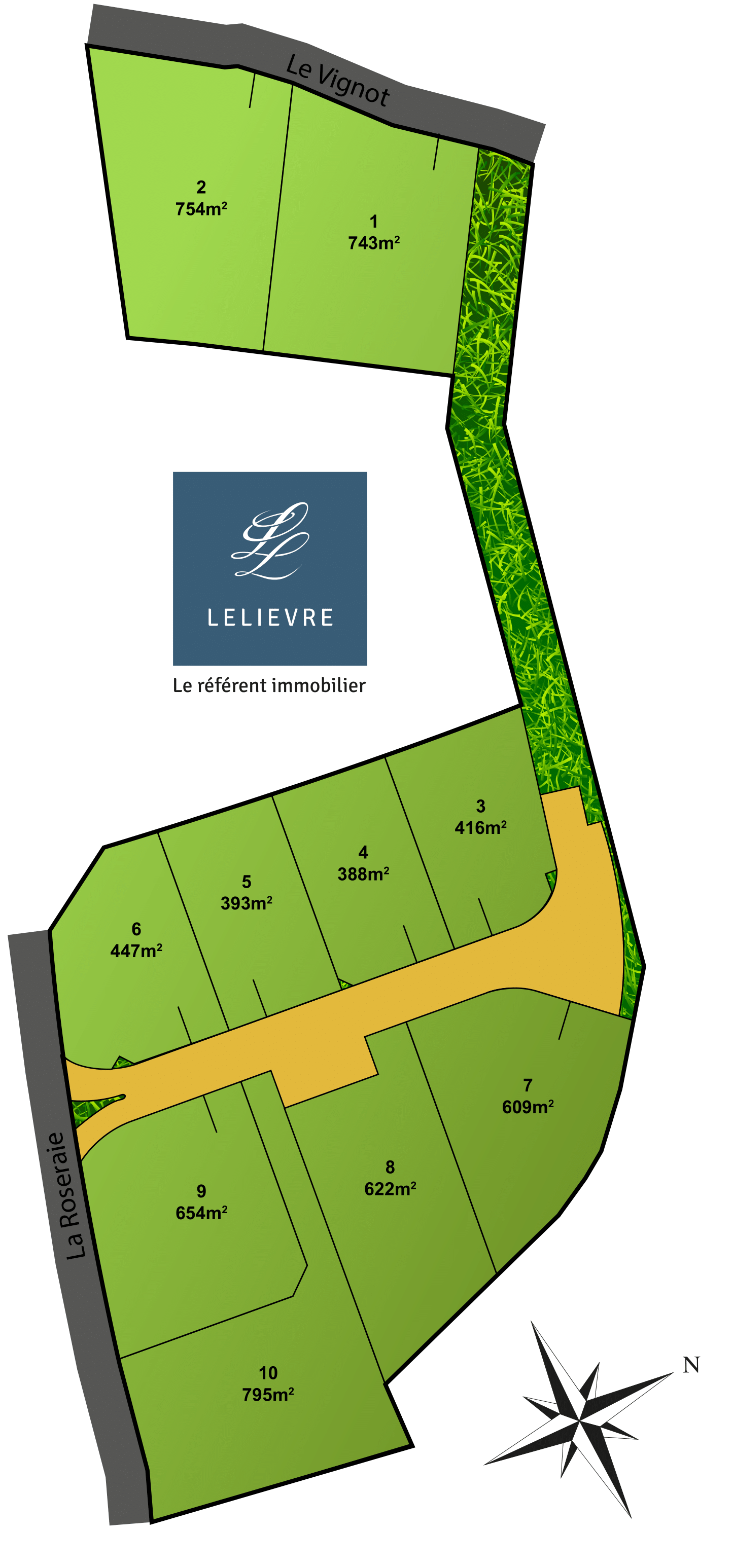 Notre lotissement propose de nouveaux terrains à bâtir, avec des parcelles allant de 388 à 797 m² et des prix démarrant à 42 000 euros.